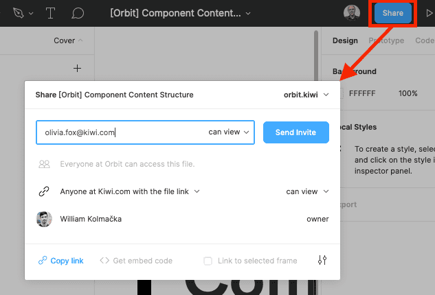 All teams are open to everyone with a kiwi.com email address, so anyone at Kiwi.com can view and comment on your designs. To make sure the right people see a specific design:
